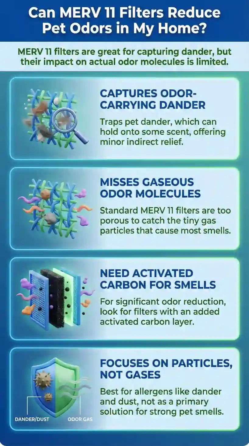 Here's what actually happens: MERV 11 filters capture the dander, fur, and dried urine particles that bacteria colonize to generate odors over time. You're not filtering the smell—you're removing the biological material that creates smell. It's indirect odor control that works gradually, not the immediate freshness most customers expect when they invest in higher-efficiency filtration.