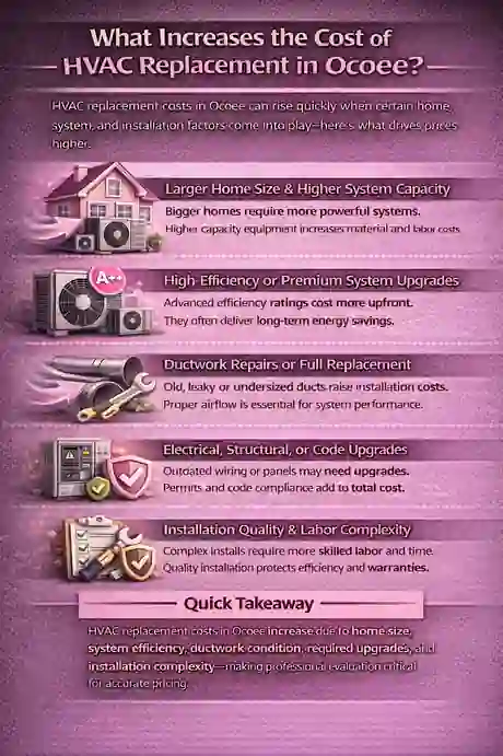 HVAC replacement costs in Ocoee often rise when real home conditions require more than a basic equipment swap. From our experience working with Central Florida homes, the most expensive surprises usually come from airflow, ductwork, and humidity-related issues that aren’t visible during an initial estimate.